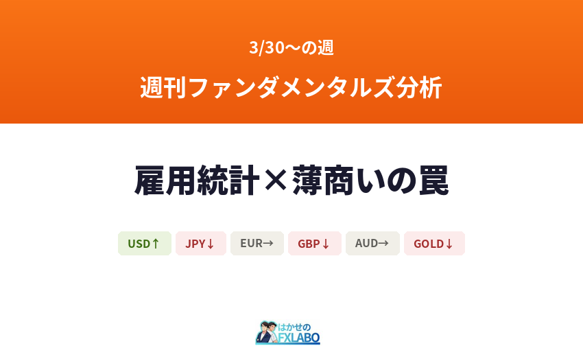 今週はパウエルFRB議長の討論会(月曜)トリプル末(火曜)ISM・ADP・小売の3連発(水曜)、そしてグッドフライデーに雇用統計(金曜)という4つの軸で相場が動きます。加えてイランとの停戦交渉の期限が4月6日に控えており、週末リスクが極めて高い週です。USD強・JPY弱の基本構図は変わりませんが、NFPの結果次第では一気にシナリオが変わります。